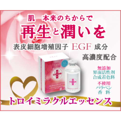 「トロイ ミラクルエッセンス」は、整肌成分EGF※を惜しみなく配合し、角層すみずみまでうるおいを届ける高機能美容液です。みずみずしいテクスチャーが瞬時に肌になじみ、キメを整えて、触れるたびにつるんとなめらかな手触りへ。毎日のスキンケアに一滴プラスするだけで、うるおいに満ちたツヤと、いきいきとした印象へ導きます。